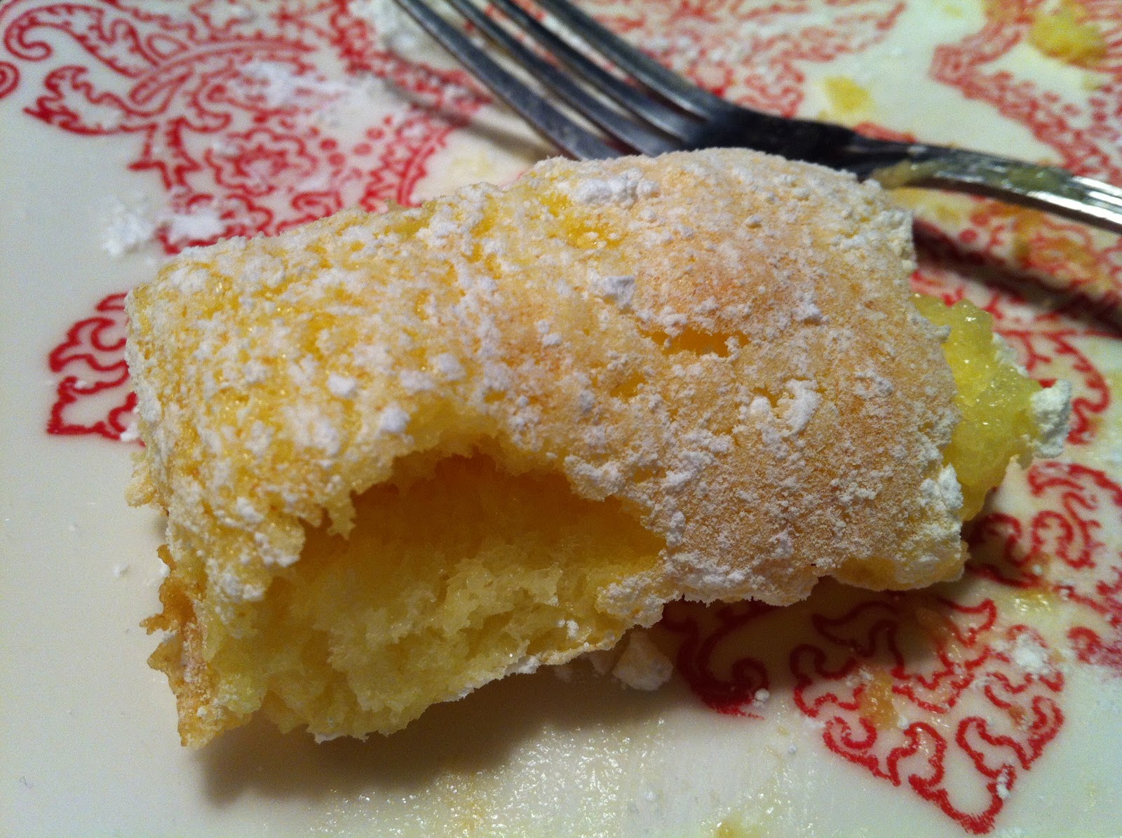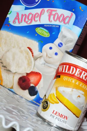 You mix an angel food cake mix and one can of lemon pie filling. Spray a 9 X 13″ pan. Pour mixture into pan and bake for 20 minutes. When cool, sprinkle with powdered sugar.