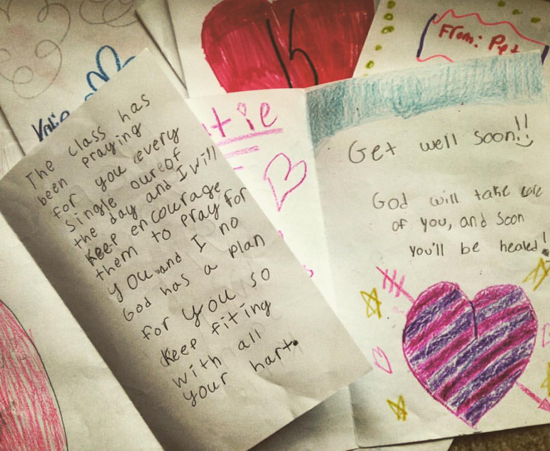 La Petite Belle got a precious care package from a class at a local (Lafayette-local) Christian school. It was filled with goodies and sweet, precious cards that the children wrote to her. She truly took her time, read through each card, treasuring the words that were written.