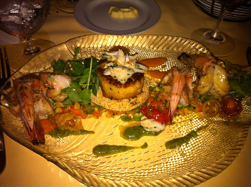 Grilled Panama Shrimp with a Ragout of Jumbo Lump Crabmeat atop a Southern Carolina Succotash & Grit Cake with a Chili Spiked Lime Sauce, & Roasted Green Chile, Cilantro Coulis