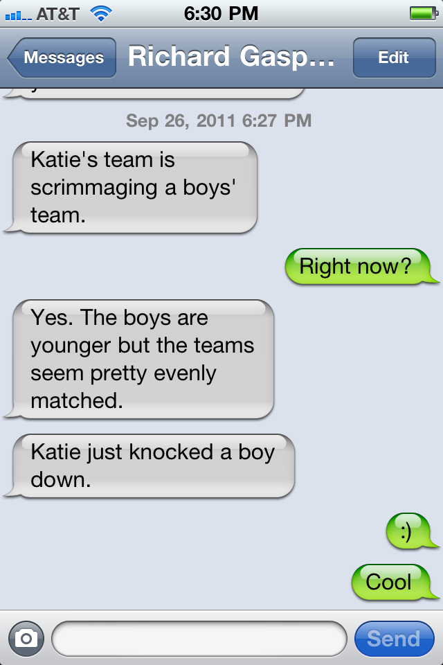 Text conversation between Beau & me while he was at La Petite Belle’s soccer scrimmage.