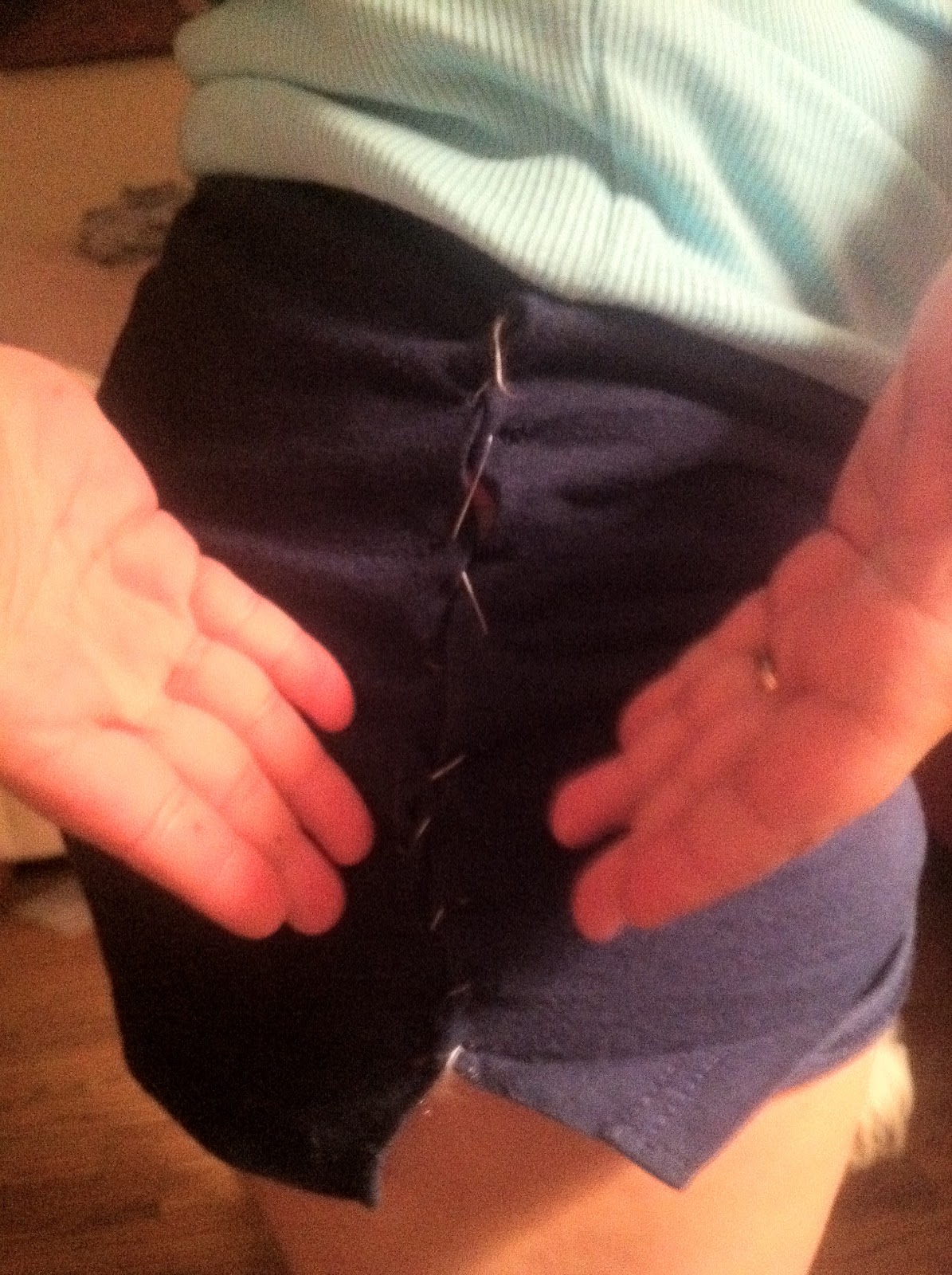 While at school, the poor dear ripped her shorts from one side to the other, requiring emergency sewing expertise.